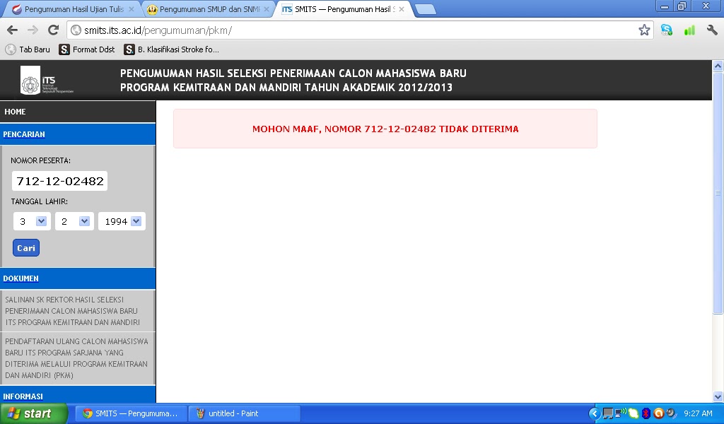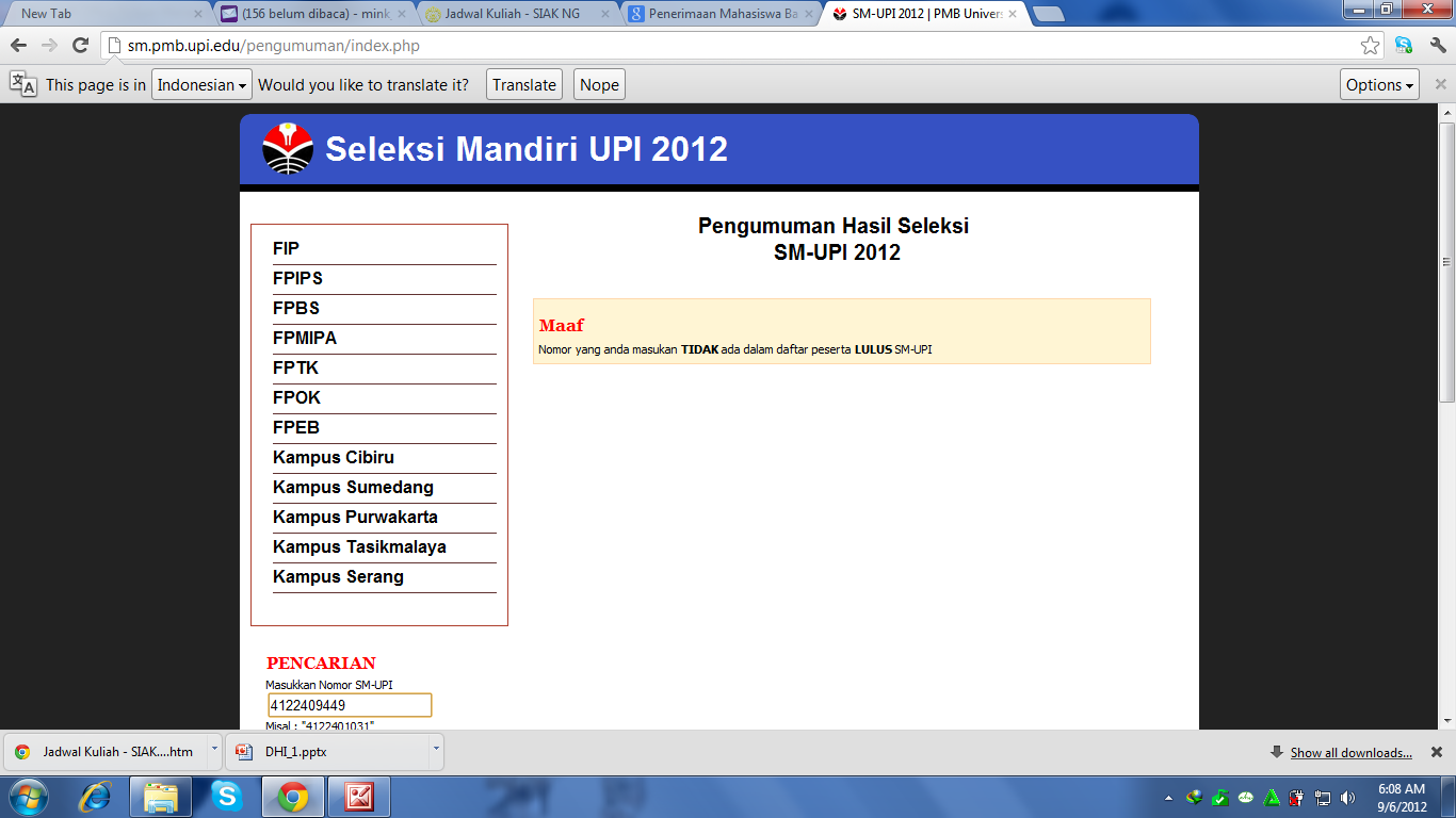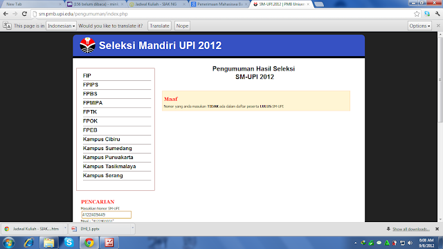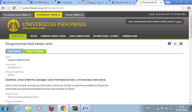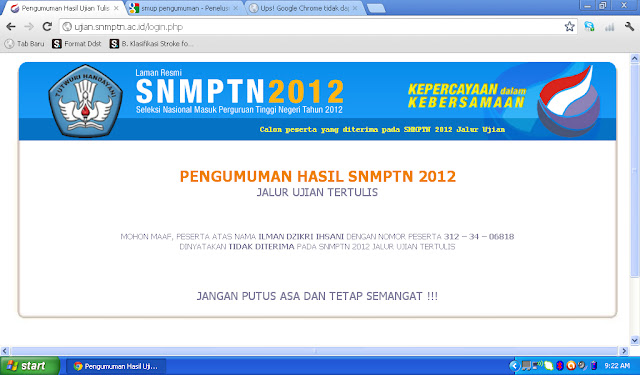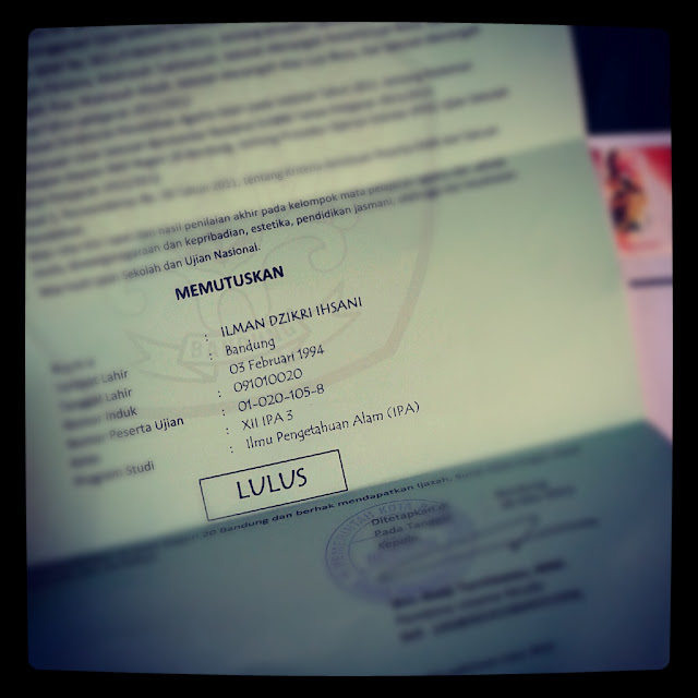 Enam Juli dua ribu dua belas. Waktu ketika Tuhan menunjukkan kuasa akan takdirnya. Sebelumnya, saya diberi saran oleh Pak Supri, guru bahasa Indonesia INTEN untuk menunda melihat hasil SNMPTN sampai setelah SIMAK. Ketika jam menunjukkan pukul 19.00, timeline twitter mulai ramai akan teman-teman yang diterima di PTN. Saya langsung telpon beberapa teman untuk menanyakan kabar dan memberi selamat pada mereka yang berhasil diterima di PTN lewat jalur itu. Saya sendiri belum tahu dan awalnya tidak mau tahu. Bunda sempat meminta saya melihat hasil tapi saya bilang tidak. Setelah makan malam, saya berusaha tidur tapi ternyata sulit karena penasaran akan hasil ujian itu. Diam-diam saya ambil handphone lalu membuka website pengumuman. tiga-satu-empat-tiga-empat-nol-enam-delapan-satu-delapan-OK. Saya semakin tidak bisa tidur .